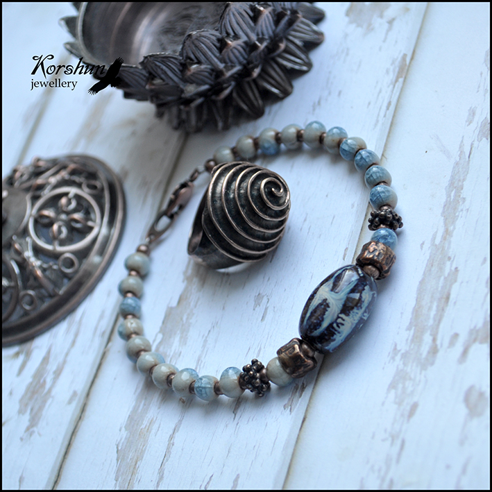 Стильный браслет из кахолонга. Очарование простоты и деталей. Необычной формы каменные бусины напоми..