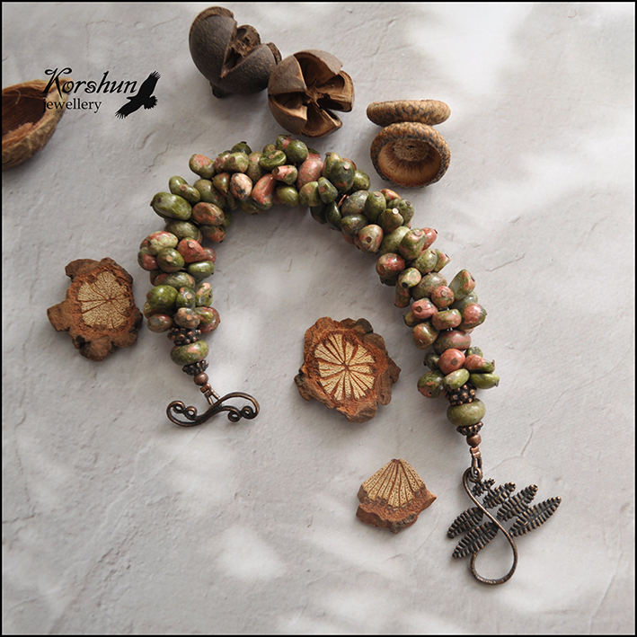 Оригинальный браслет из необработанного унакита и авторской медной фурнитуры ручной работы. Цвет пап..