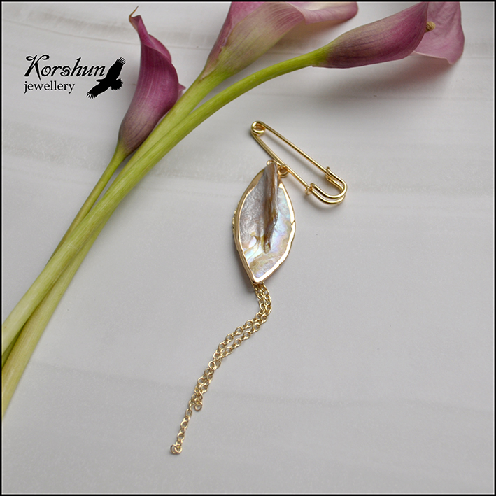 Необычная нежная брошь с крупным перламутровым лепестком. Прекрасно подойдет для украшения отворота ..