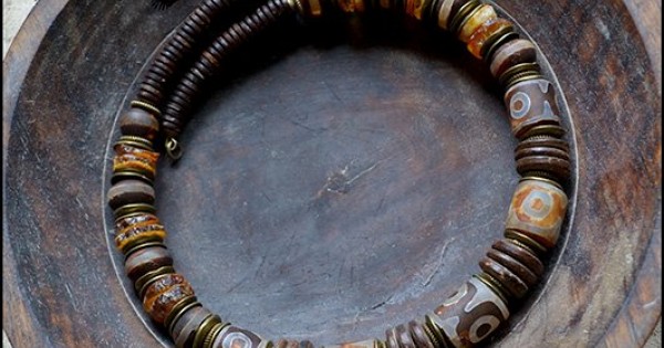 Этническое колье из тибетского агата Дзи, кокоса, янтаря и кости. Колье смотрится как спло..