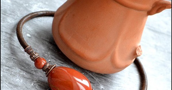 Интересное колье с бусинами необычной формы из красной яшмы. Терракотовые, словно глиняные камн..