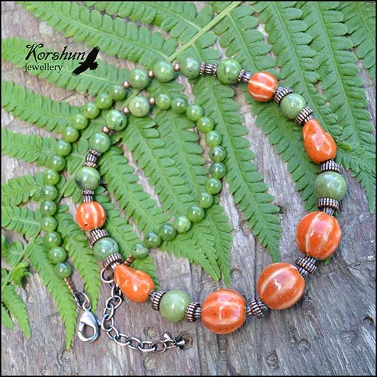 Колье в этническом стиле из нефрита и керамических бусин ручной работы. Яркое и теплое - удивительно..