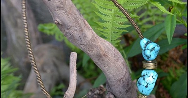 Длинное колье из турквенита и патинированной латунной фурнитуры. Длинная игривая река Соча, бурлящая..
