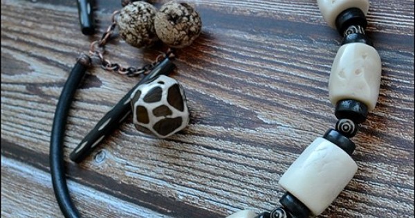 Оригинальные колье и бусы из кости совершенно не обязательно носить исключительно в сочетании с оголенной шеей и верхней части груди. Многие модели отлично себя чувствуют, находясь поверх тонких воротников, водолазок, платьев и тому подобного. Главное здесь – не дать вашему аксессуару потеряться на фоне излишне крикливого принта или слиться в единый тон с цветом одежды.
