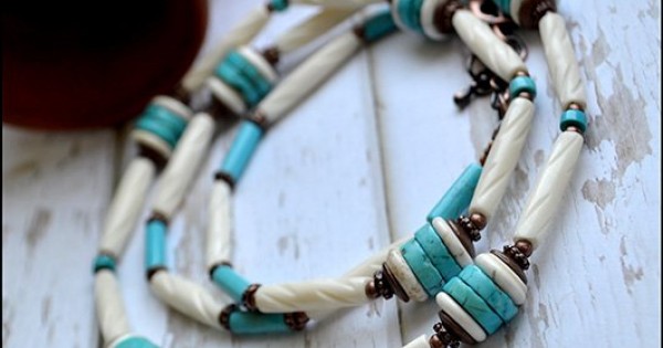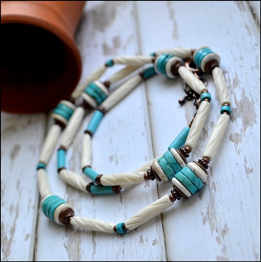 Колье в этническом стиле из бирюзы, магнезита и кости. Украшение навевает мысли о городах давно..