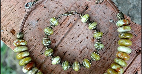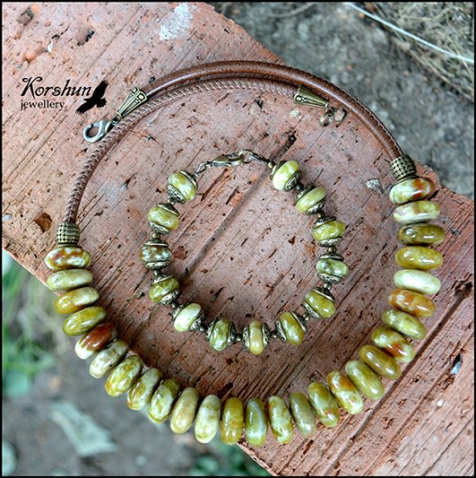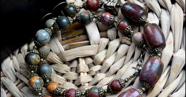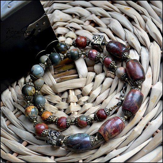 Винтажное колье из яшмы Пикассо и латунными бусинами ручной работы. Изысканное украшение, ..