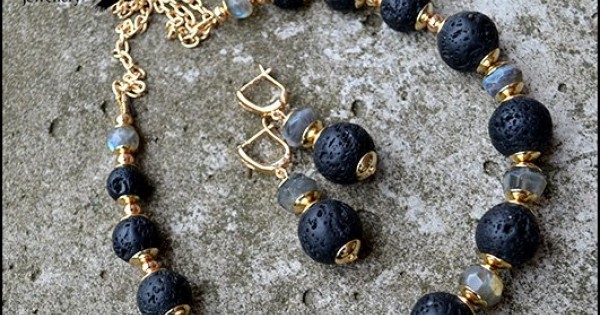 Стильное колье с лавой, гематитом и лабрадором. Кулон из лавового камня напоминает вечную спутницу З..