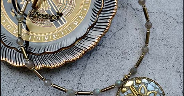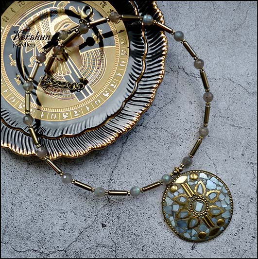 Великолепное колье из перламутра, лабрадора и гематита с этническим кулоном ручной работы. Укра..