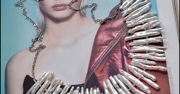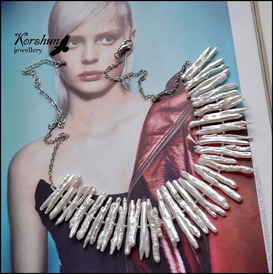 Необычное колье из барочного жемчуга. Белоснежные палочки напоминают игольчатый иней на ве..