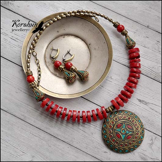 Колье в этническом стиле с непальскими бусинами ручной работы и кораллом. Яркое украшение,..