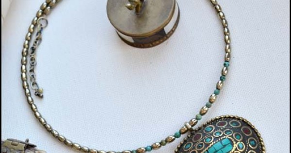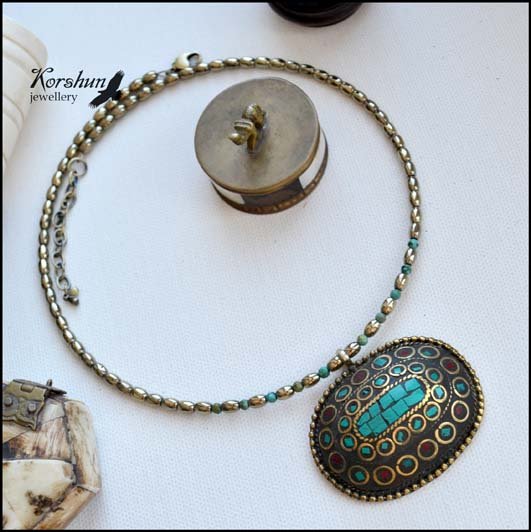 Восхитительное колье в этническом стиле с непальским медальоном ручной работы из гематита, коралла и..