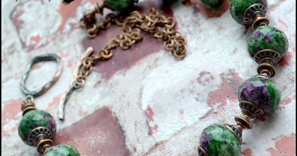 Крупное колье из цоизита. Глубокий зеленый цвет камня разбавляется пятнами рубиновых друз, словно гр..