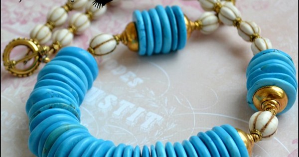 Крупное и яркое украшение из прессованной бирюзы и говлита. Фурнитура цвета античного золота оч..
