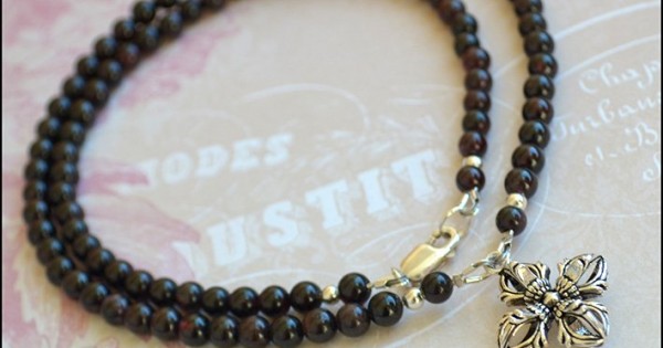 Изысканное украшение из граната и серебра. Две нитки капель гранатового вина сходятся..