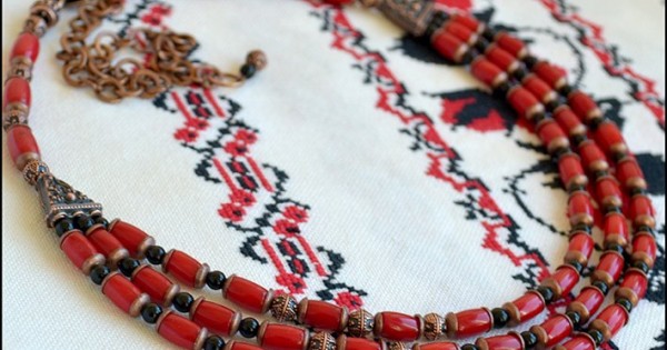 Трехрядные бусы из кораллов в стиле украинского национального украшения - корали. Корали состоя..