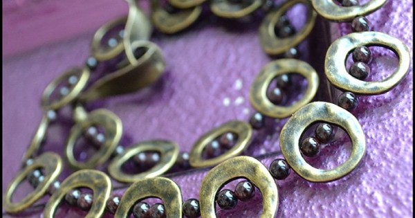 Оригинальное колье из граната и необычных латунных бусин, два компонента сплетаются, создавая кружев..