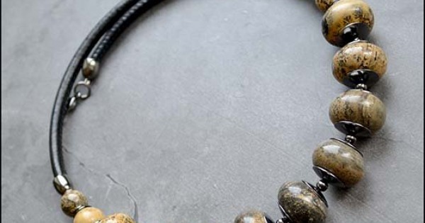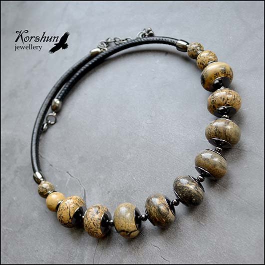 Строгое колье из яшмы Чохуа и кожи производства Испания. Каждая бусина как отдельный кадр&..