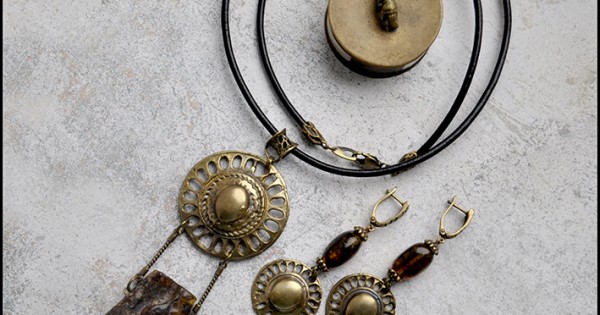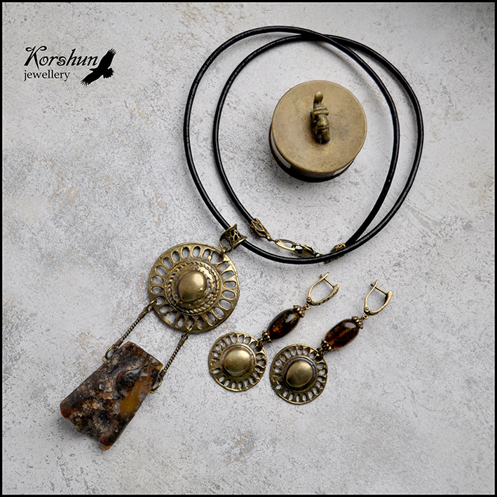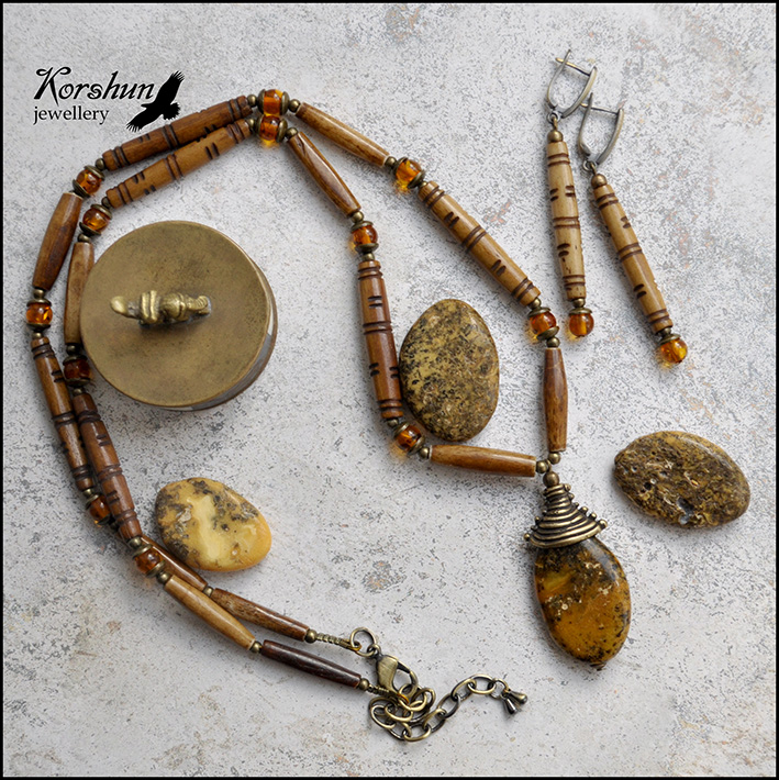 Эффектный комплект в этническом стиле с диким янтарем и авторской фурнитурой ручной р..