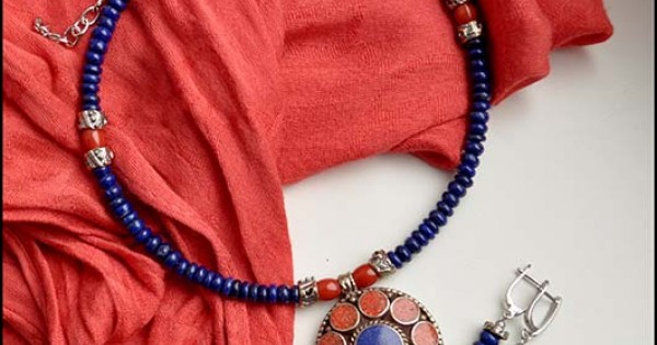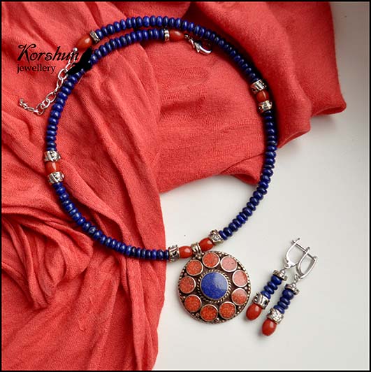 Комплект в этническом стиле с насыщенными лазуритом и кораллом. В центре украшения объемный мед..