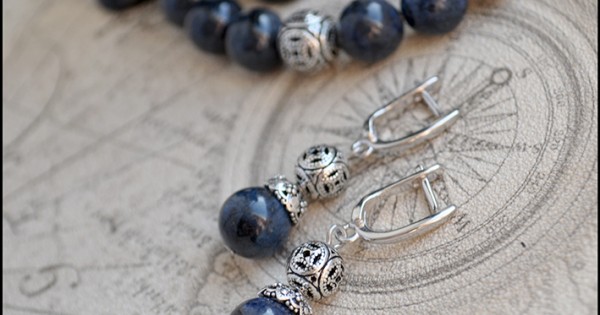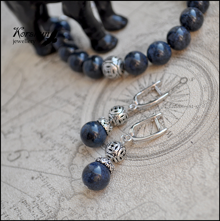 Серьги "Океан". Серебряные серьги с дюмортьеритом. Синие бусины неоднородные по цвету слов..