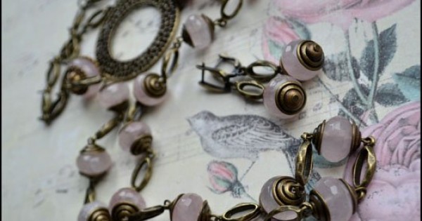 Асимметричный комплект украшений из розового кварца. Нежную красоту камня подчеркивает латунная..