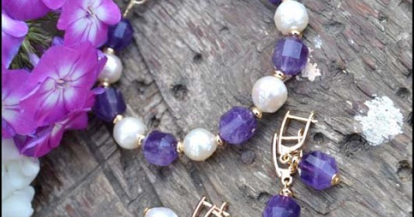 Роскошный комплект украшений из волшебного аметиста и жемчуга Касуми-лайк. Элегантный и в то же врем..