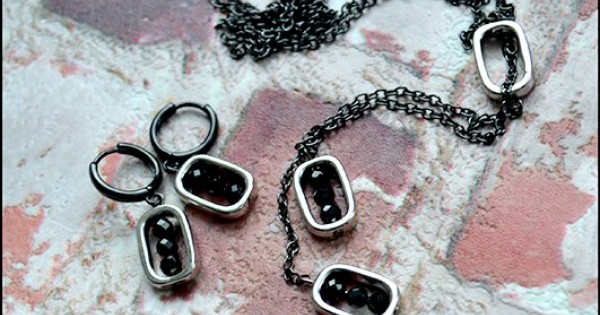 Комплект украшений с черной шпинелью в стиле High-tech. В этом украшении соединены два цвета металла..