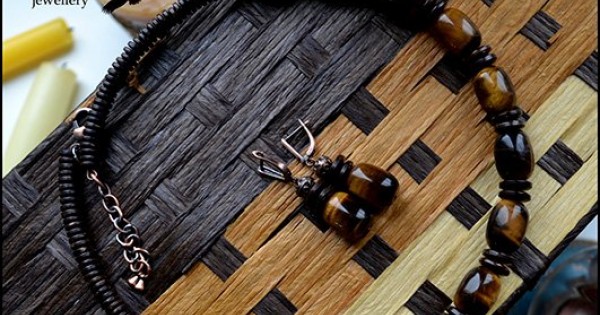Универсальный комплект украшений из тигрового глаза и кокоса. Полупарюра получилась уютной..