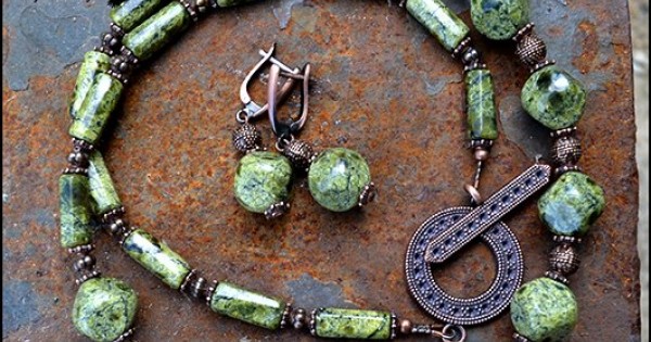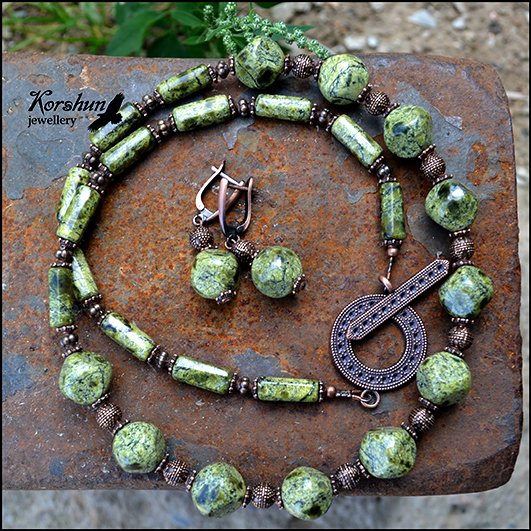 Комплект украшений из змеевика. Камень напоминает густую зелень непроходимого леса, завлекающего шеп..