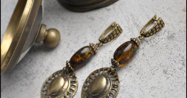 Эффектные крупные серьги в этническом стиле с диким янтарем и авторской фурнитурой ру..