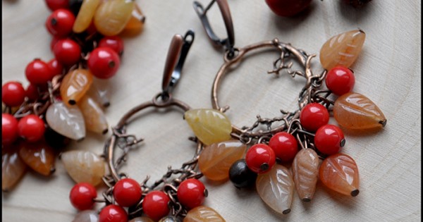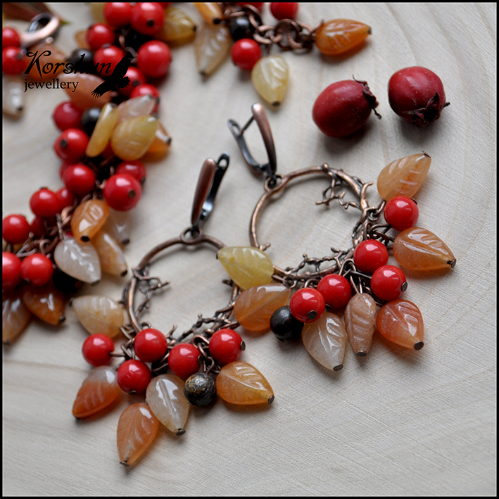 Яркие серьги с фурнитурой ручной работы, кораллом и сердоликом. Ветки боярышника поцелованные осенью..