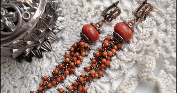 Серьги-грозди в винтажном стиле из натурального губчатого коралла. Всполохи рябиновых гроздей в стар..