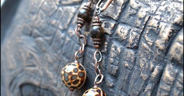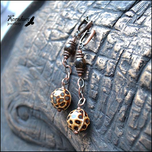 Серьги в этническом стиле с бронзитом и керамическими бусинами из Ганны. Животный принт - модное сов..