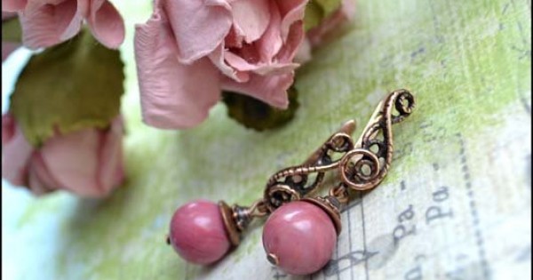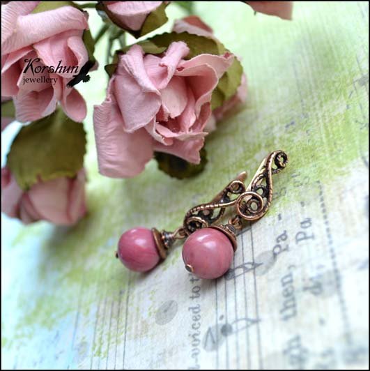 Милые серьги с уральским родонитом. Авторские швензы в виде скрипичных ключей задают тематику украше..