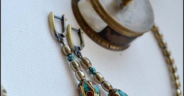 Серьги в этническом стиле из гематита, коралла и бирюзы с непальскими бусин..