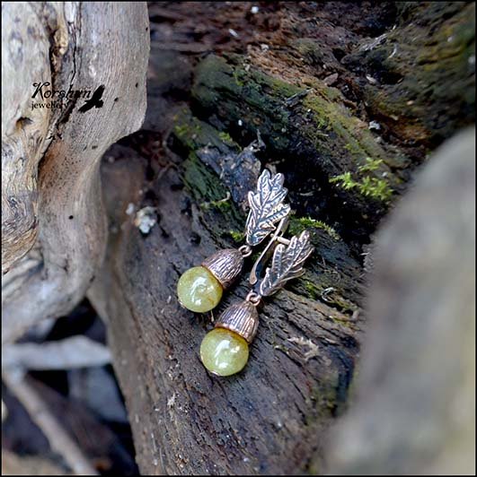 Интересные серьги с зеленым гранатом. Гроссуляр в сочетании с медной авторской фурнитурой ручной раб..