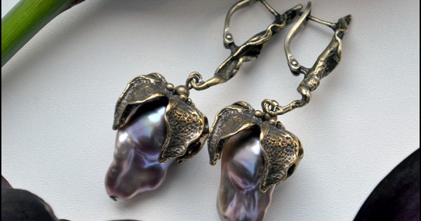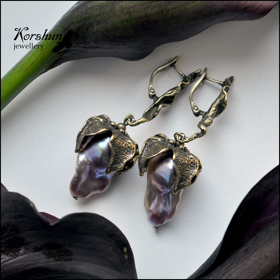 Роскошные серьги с фурнитурой ручной работы и восхитительным барочным жемчугом с завораживающими пур..