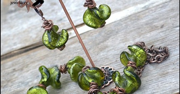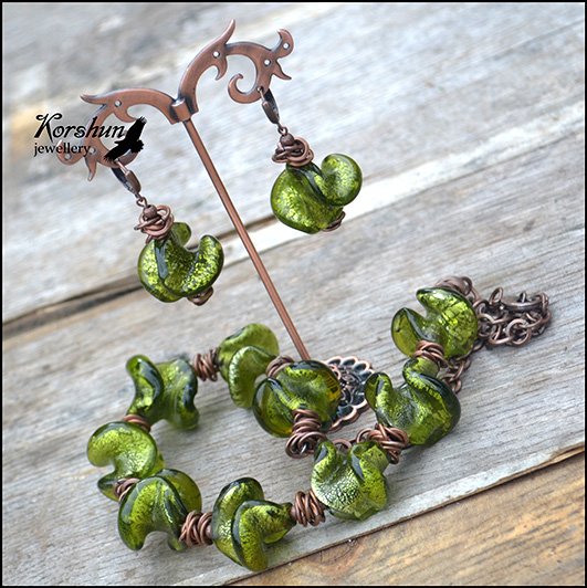 Серьги с необычными стеклянными бусинами. В них соединились оригинальность формы и переливы зеленого..