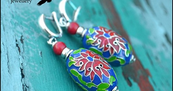 Яркие серьги с кораллом. Эмалевый рисунок изображает алый лотос - священный цветок Востока, как в др..
