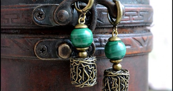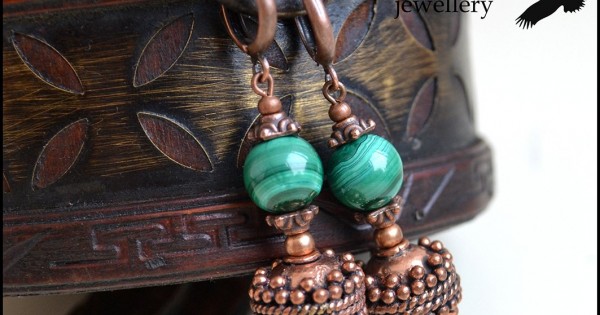 Серьги "Тара". Красивые крупные серьги из уральского малахита с индийскими медными бусинам..