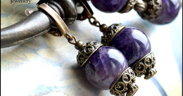 Серьги в стиле Винтаж. Красивые медные шапочки хорошо подчеркивают фиолетовый цвет бусины натурально..