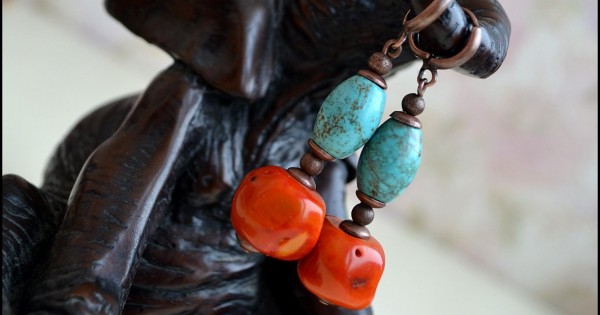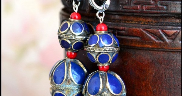 Красивые крупные серьги в этническом стиле, из старых афганских бусин и красного коралла. Запах прян..